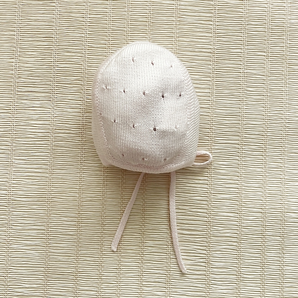 Capota tejida en perlé rosa bebé con calados de ojetes.