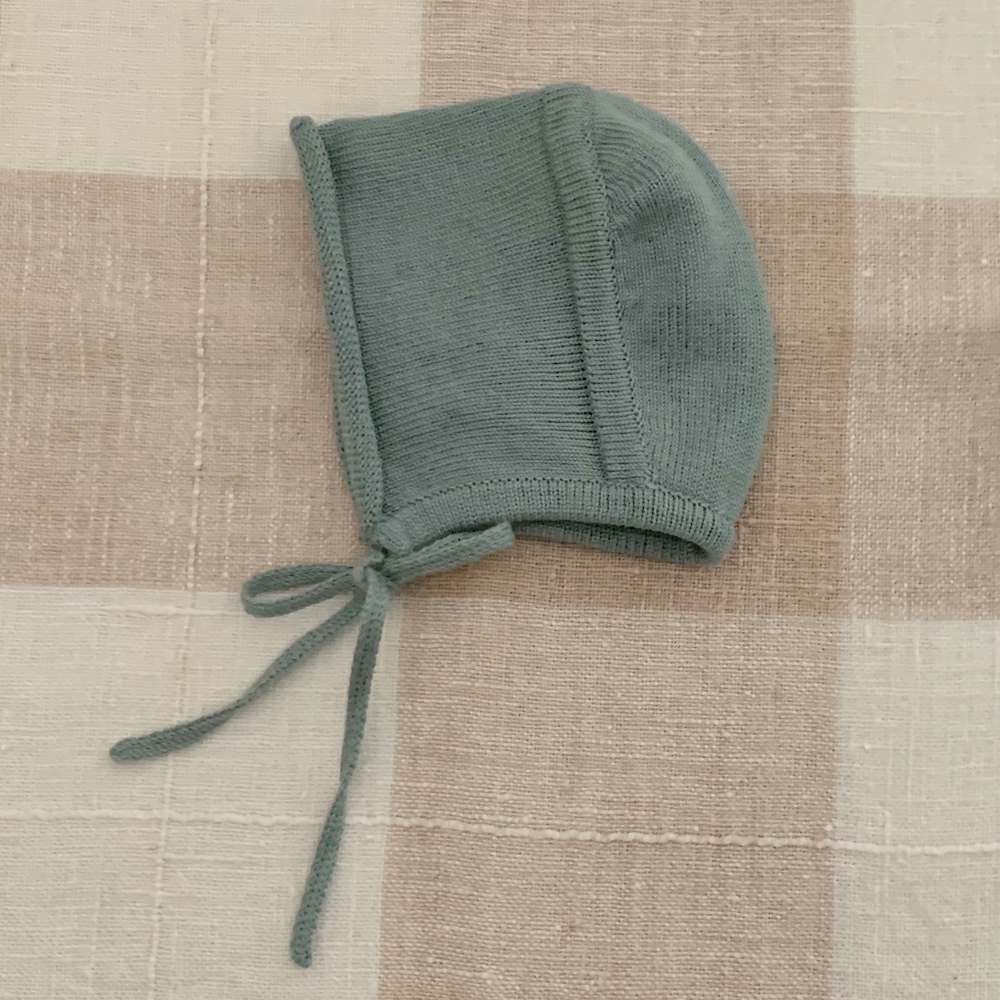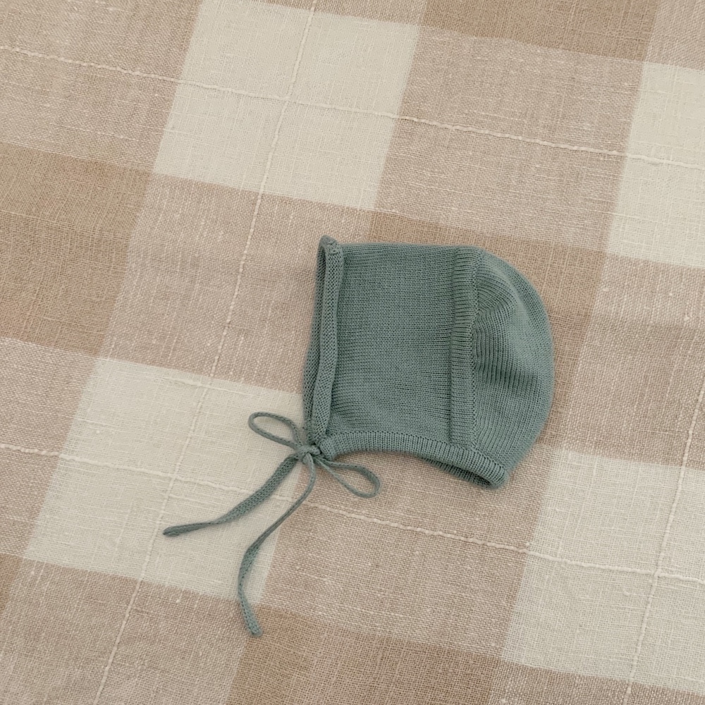 Capota tejida en perlé color verde ciprés con bordado a mano de 3 nuditos en la parte superior del rulo.