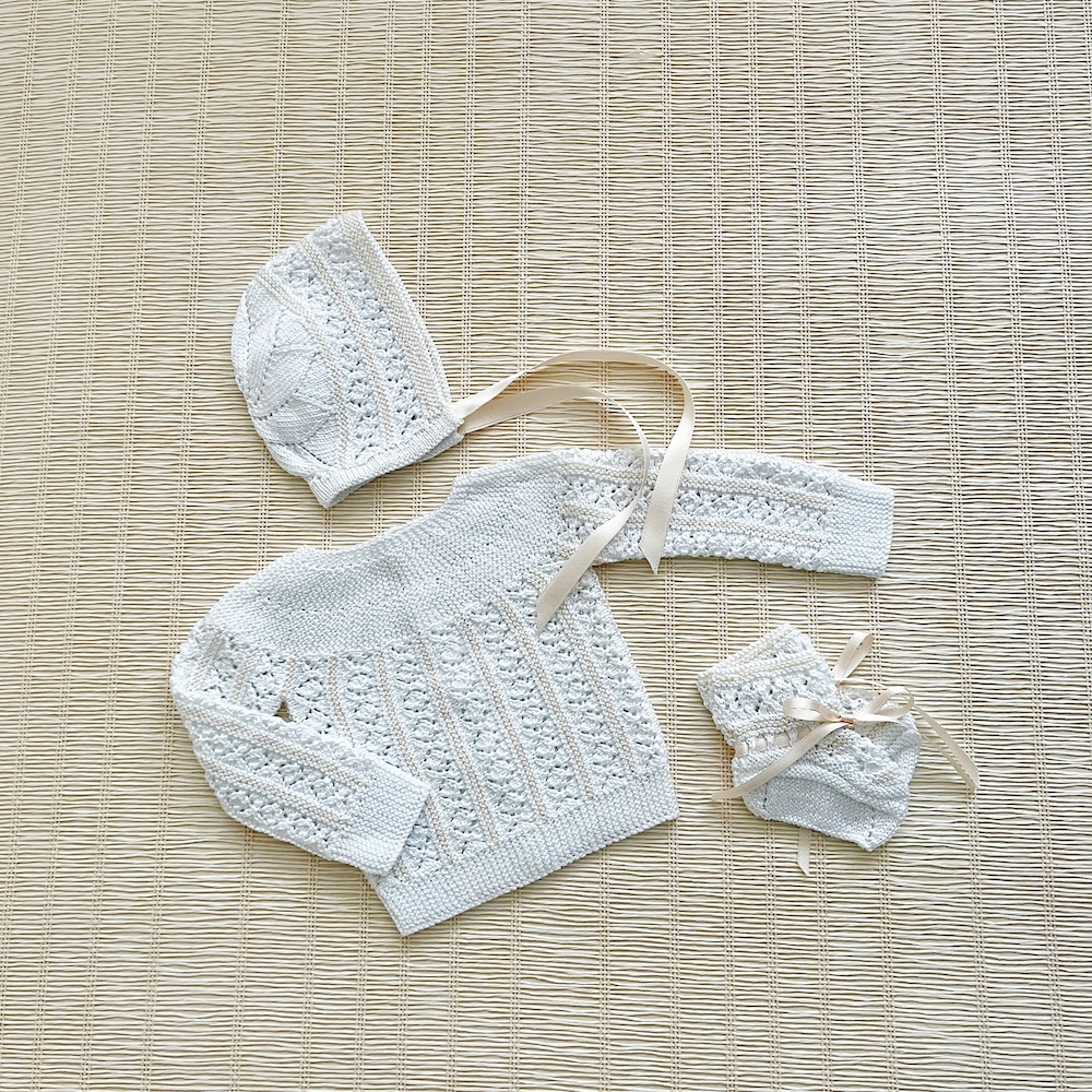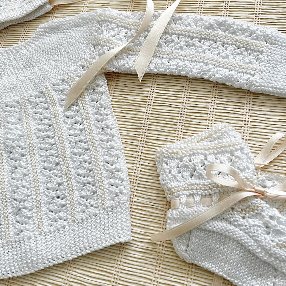 Tejidos a mano en punto de perlé color blanco con dibujo de rombo y vivos en perlé beige.