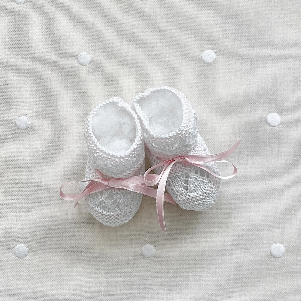 Patuco para bebé tejido a mano en perlé de algodón color blanco con pasadas en rosa.