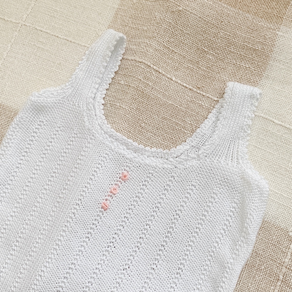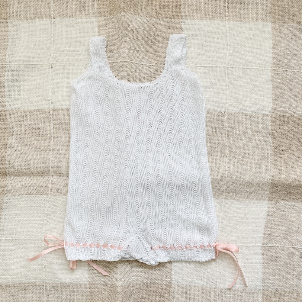 Pelele de tirantes tejido en color blanco con caladitos, y pierna recta con lazadas (extraibles) para ajustar.