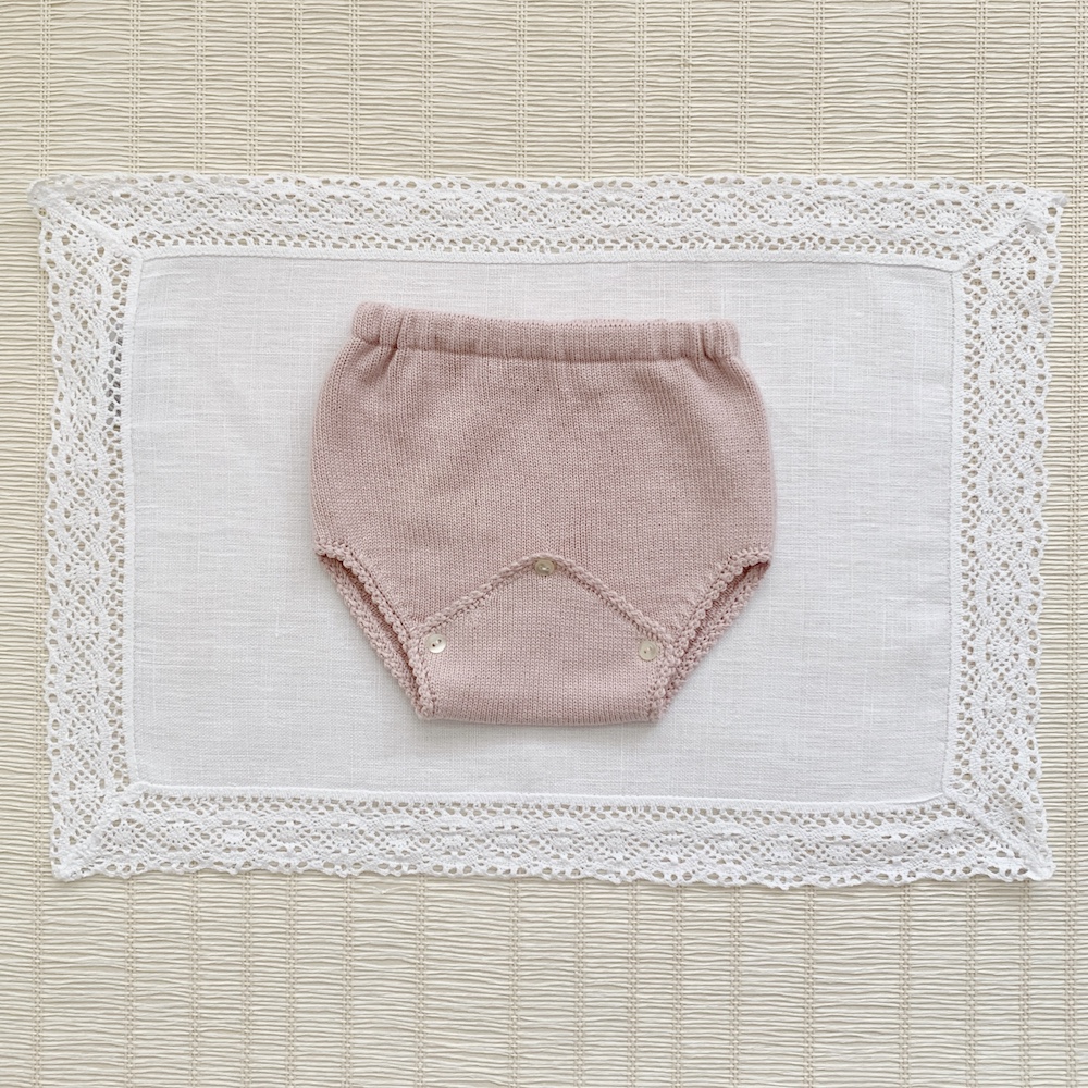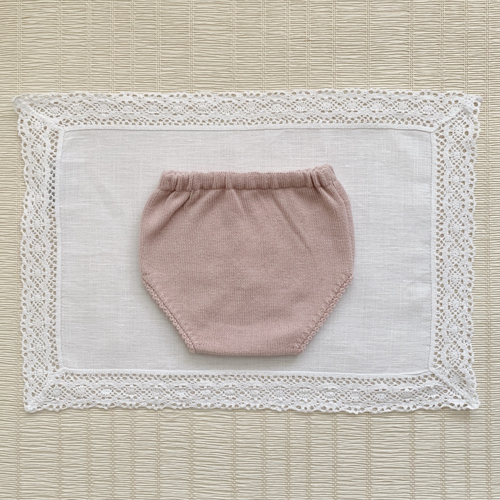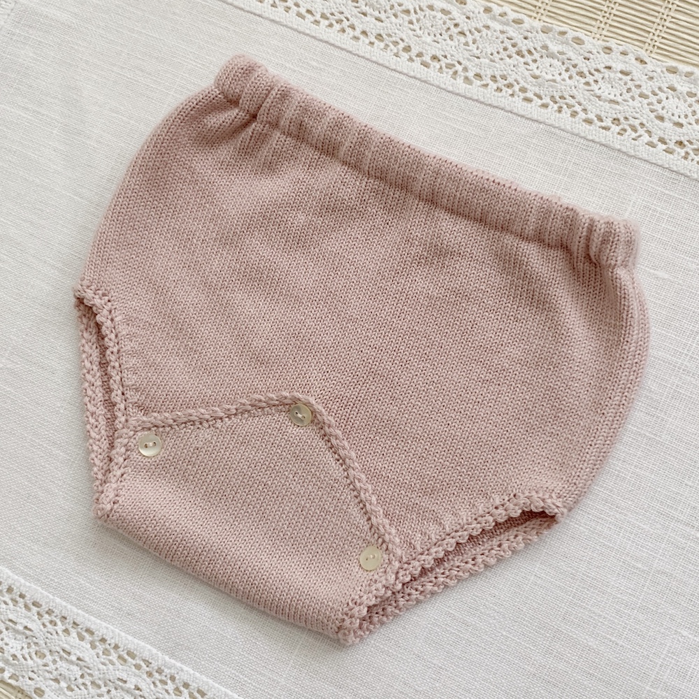 Ranita para bebé tejida en perlé color rosa palo con corte pico en el delantero .